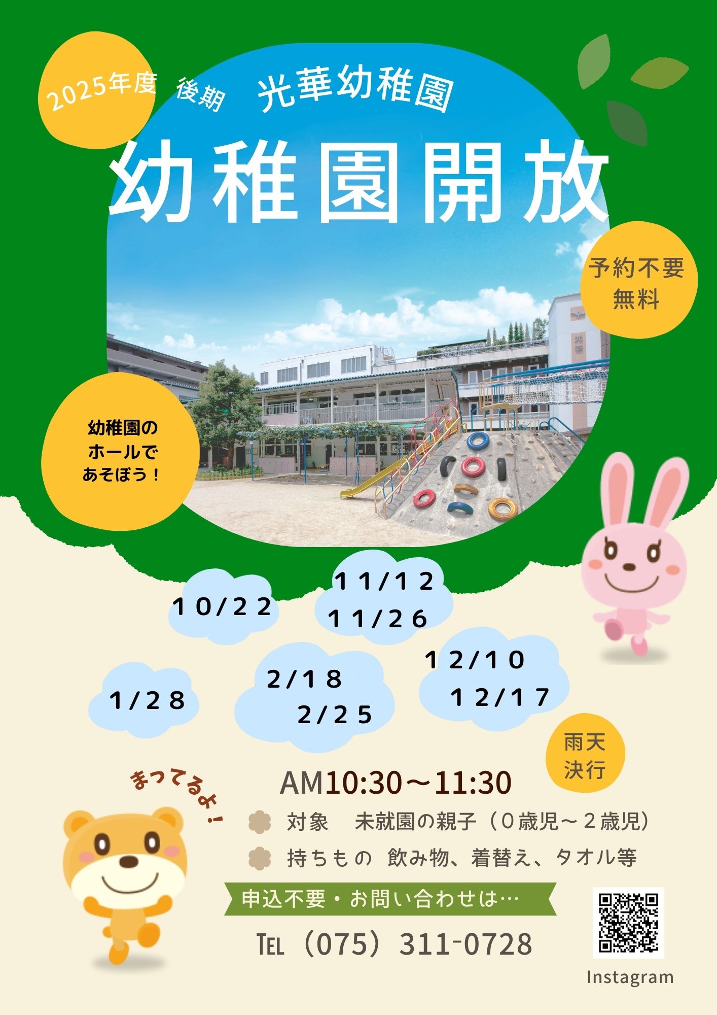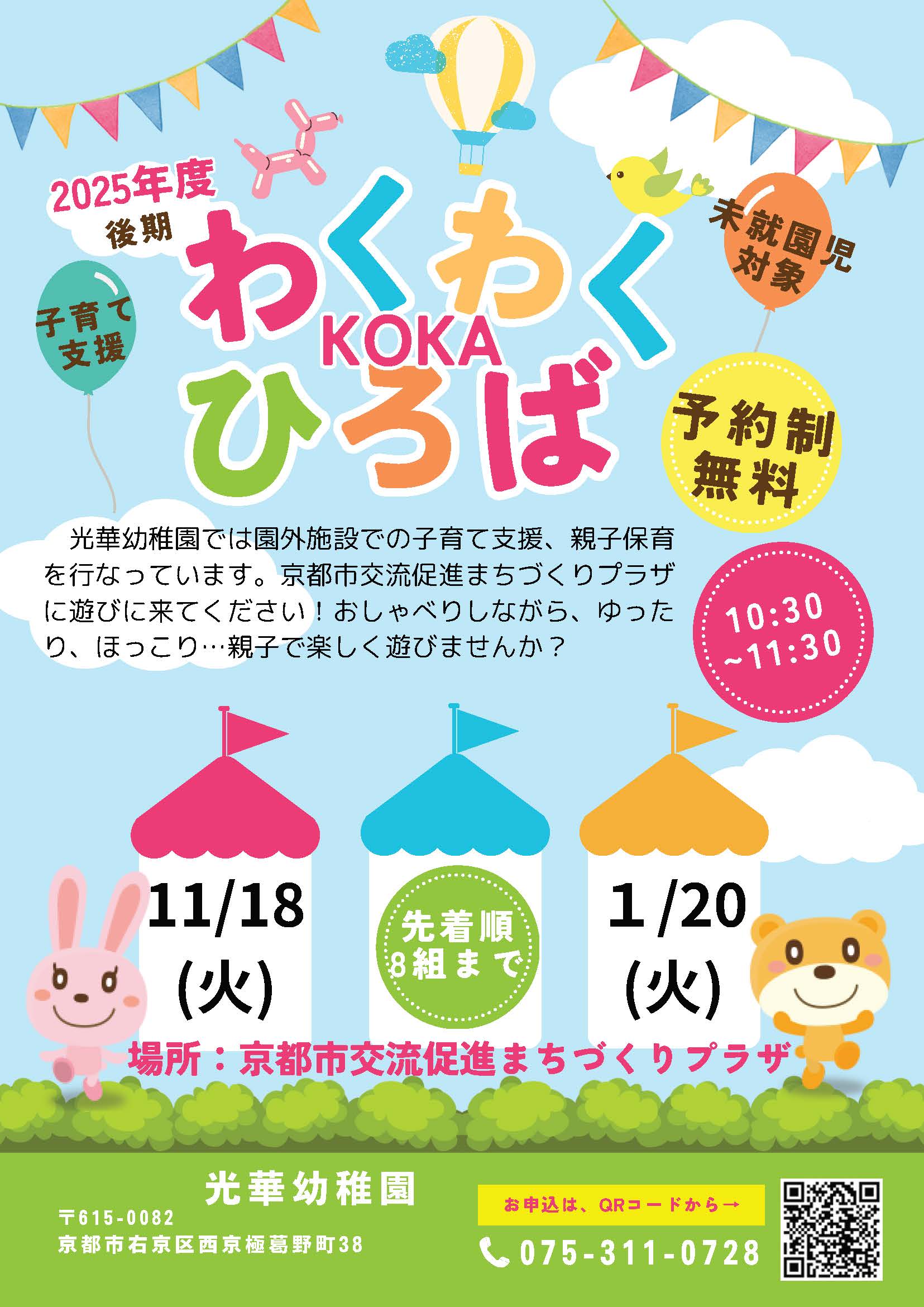 京都市の施設「京都市交流促進・まちづくりプラザ」にて、園外での子育て支援、親子遊びを開催しています。本園教員による歌遊び・ふれあい遊びを行っています。